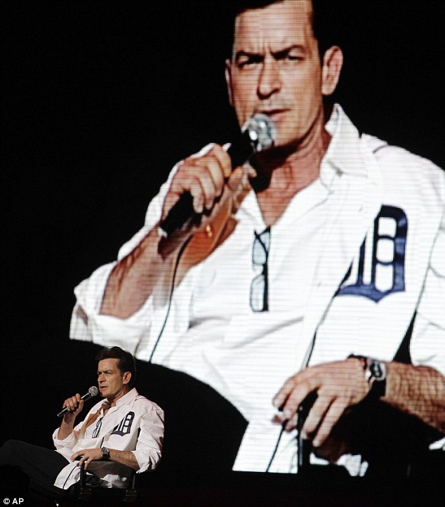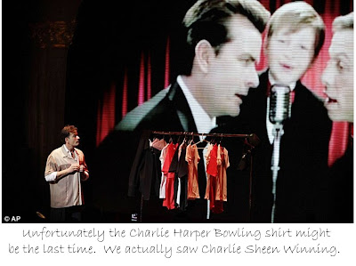 When Sheen took the stage, there was not a single empty seat. He then put on a Charlie Harper (his character on Two and a Half Men) style bowling shirt, ripped it off, and burned it. Then he whips out a Major League style Detroit Tigers baseball Jersey.