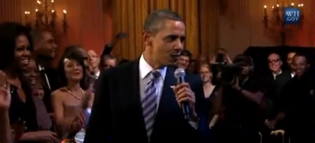 Obama is a ham, he tries to look like he’s not going to sing, but you can see he has all the intentions in the world of singing.  The band is still playing and Obama goes in….