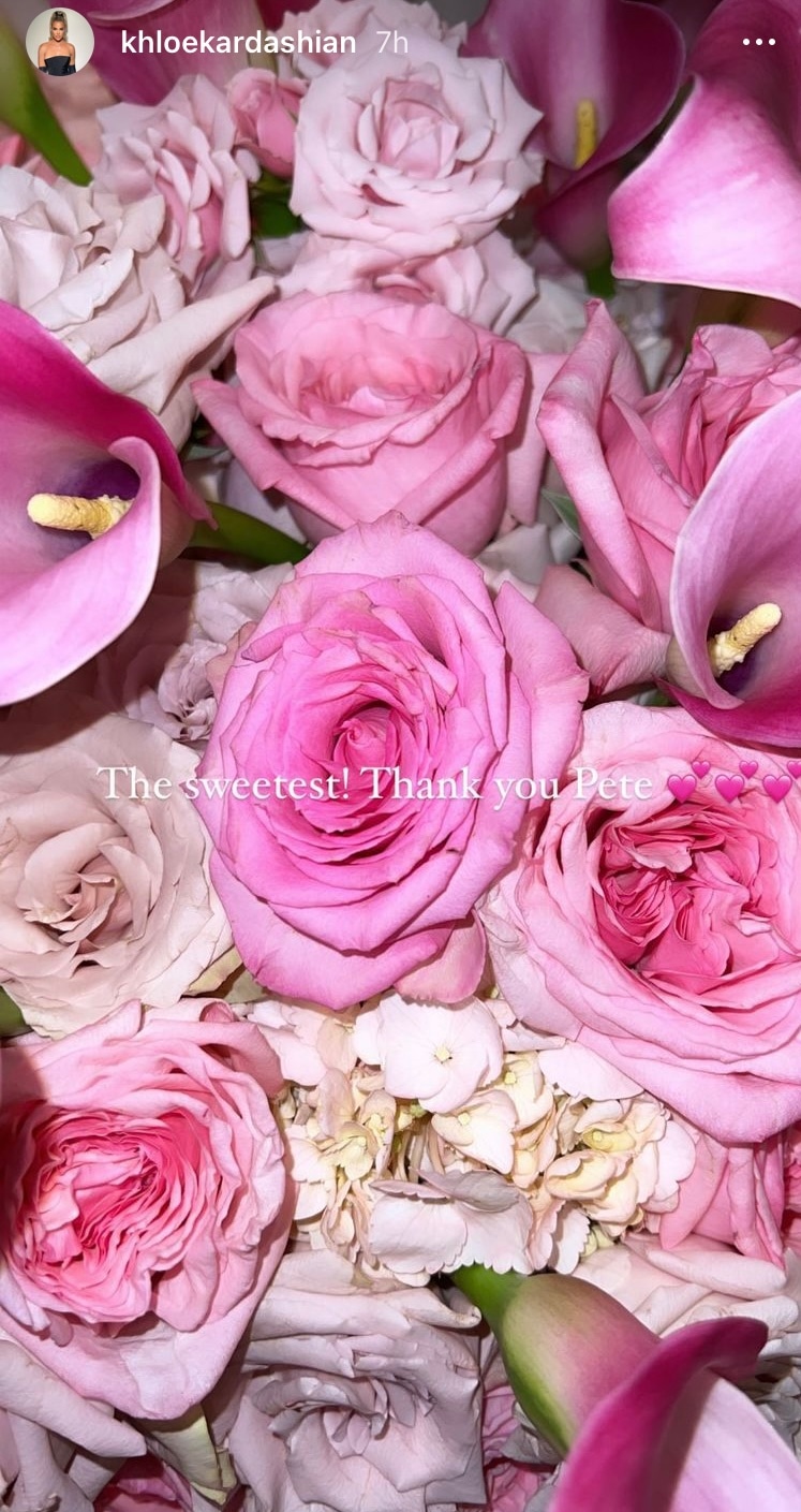 In a Feb. 14 Instagram Story post, Khloe shared a picture of a pink floral bouquet arrangement that included calla lilies, roses and hydrangeas, writing, ‘The sweetest! Thank you Pete!’